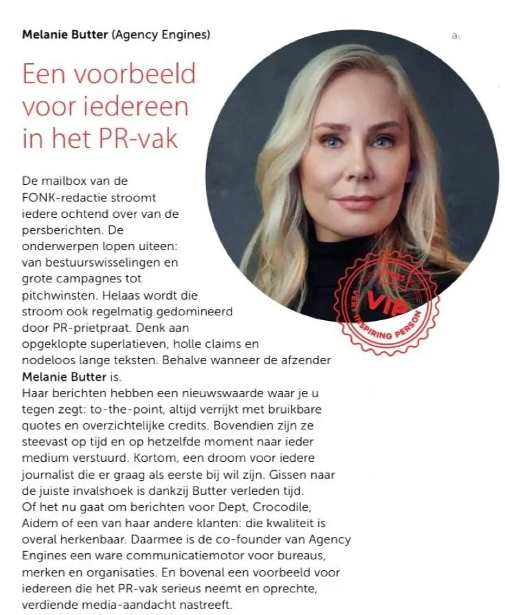 Ik ben Melanie Butter: PR Strateeg, Consultant en co-founder van Agency Engines.